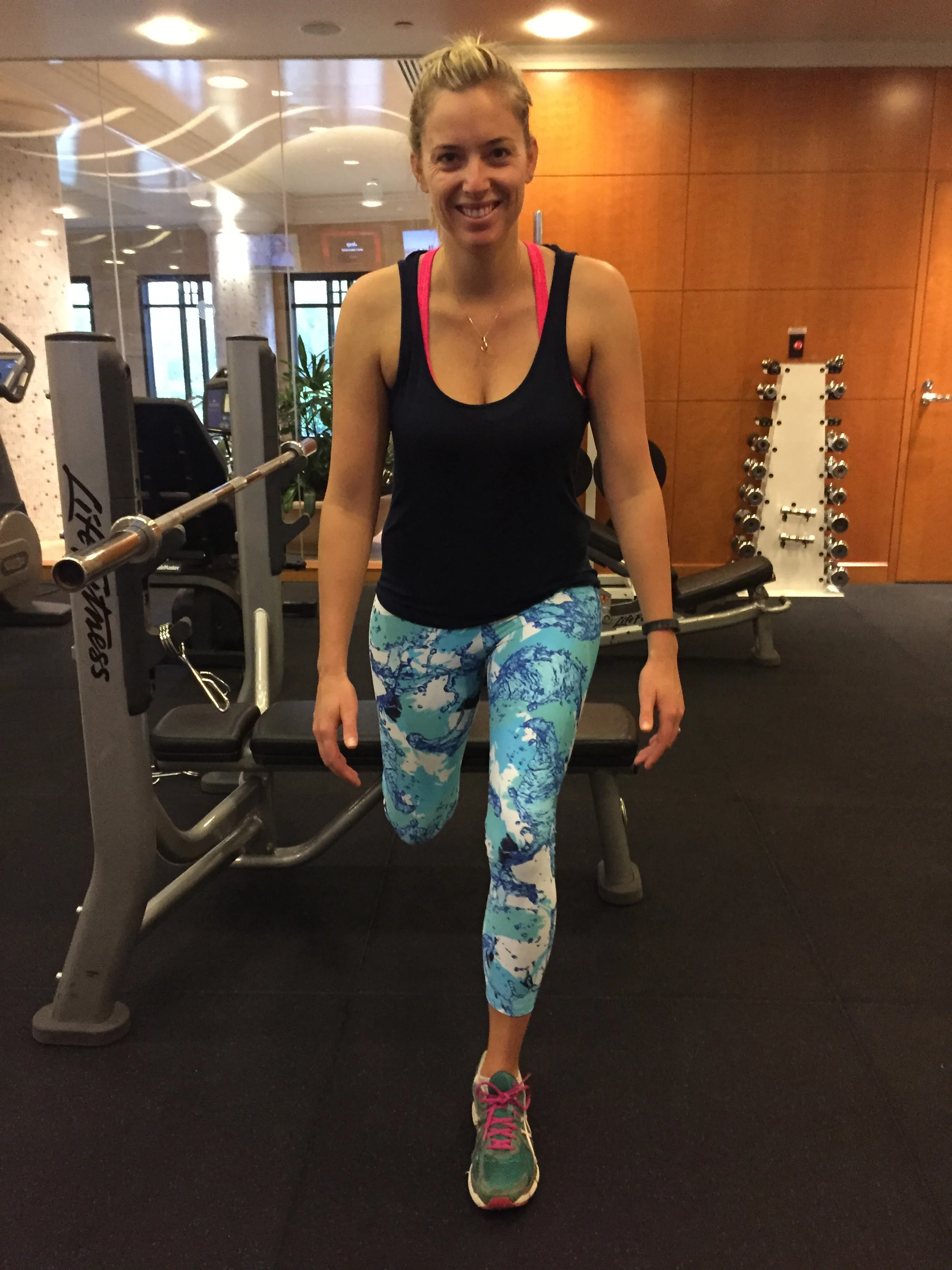 And finally, the Bulgarian Lunge (a lunge with the back leg up on a step or bench). The great aspect of this exercise is the knees are a level height and you can accurately see the gap needed between them to keep the hips and pelvis level. Being critical, my balance is not good enough to stand up straighter or lunger lower down, both of which would be a more ideal representation of the exercise.